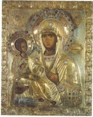 嫌なこと思い出しちゃったわ。 聖母の隣のこの人形! ・・この間移住した家族を訪ねてフィリピンに行った時に、家族が「どうしても持たせたくて・・」といって借りてきた変な人形じゃないの! これよ。 サントニーニョとかいうスペイン語の危ない赤ん坊人形。 (something I didn't like is not a strange doll that my family borrowed. When I visited the immigrated family to the Philippines,"I really want to have it ..."! A dangerous baby doll in Spanish called Santoninho. Everyone is strange and religious. ... It went to say this is it.) なんかやたら軽くって・・カサカサいってるの。 西洋のキリスト教はちょっと変わっていてよくわからないわ・・。 日本はキリスト教の発祥の地域からはとても離れているのよ。 だから、本当のことを知るのは難しいわ。 正統なものに近いのは・・これかしら? パナギア(生神女マリヤ)のイコンという宗教絵画だそうです。 Something close to the orthodox said that it is a religious painting called Icon of Panagia (Theotokos Mary). キリスト教といっても地域によって変容しているから・・・ これはちょっとロシア風かしら? (It is depending on the region ... Even though Christianity is changing , )